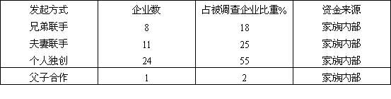 从上表可以看出,家族企业中个人独创和夫妻联手两种发起形式占所有企业的80%,说明中国家族企业中以一家为主体的家族企业占绝大多数。另据郭朝先、陈斗仁先生对中国私营企业股权结构的典型调查分析数据,我们得出如下结果。