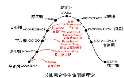 西方学者对家族企业的生命过程作过深入地研究,有多种理论体系,著名的有美国艾迪思研究所伊查克 o 艾迪思(Ichak Adizes)博士的企业生命周期理论和哈佛大学拉瑞葛雷纳教授的企业成长五阶段模型等。其中艾迪思的企业生命周期理论影响较大并被广泛接受。见下图: