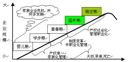 根据艾迪思的理论,与世界上著名的百年以上家族企业相比,如瑞士的劳力士(Lolex)公司和和美国的杜邦公司(年龄都超过200岁)、美国的通用汽车公司和西方电气公司(也都100多岁),中国相对比较长寿的家族企业只能算刚刚度过学步期进入青春期,而绝大多数还处在婴儿期和学步期的初级阶段。企业在青春期之前(包括青春期),是威胁和危机最多、变革最剧烈、死亡率最高的时期。这也是我国一些刚刚进入规模化经营,产权制度和治理结构面临变革的家族企业是否能够健康成长的关键时刻。在企业的学步期的后半阶段,随着企业规模扩大,创始人就要有意识的建立科学的授权体系,逐步吸纳职业管理人员进行专业化管理,为产权制度和治理结构变革的顺利实现打下基础。企业的青春期是实现这些变革的关键时期,是企业迅速发展与管理规范化、企业创始人与职业经理人、创始人与家族成员、职业经理人与家族成员等各种矛盾最为复杂、冲突最为激烈的时期。处理不当或矛盾激化,就会出现企业早衰、倒退、分裂以至死亡等恶果。在青春期,企业除了要避免多元化陷阱和盲目投资等经营上的失误外,产权制度和治理结构的转型是顺利渡过青春期实现企业更大发展的关键所在。